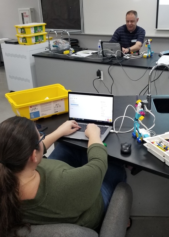Amanda Russo, teacher at Creekside High School in St. Johns County, listens to Robert Lane, a Lego Education Academy certified trainer, as he instructs his virtual and in-person audience how to program a breakdancing robot to keep in rhythm with lights and beats during the Florida Computer Science Festival in Palatka.