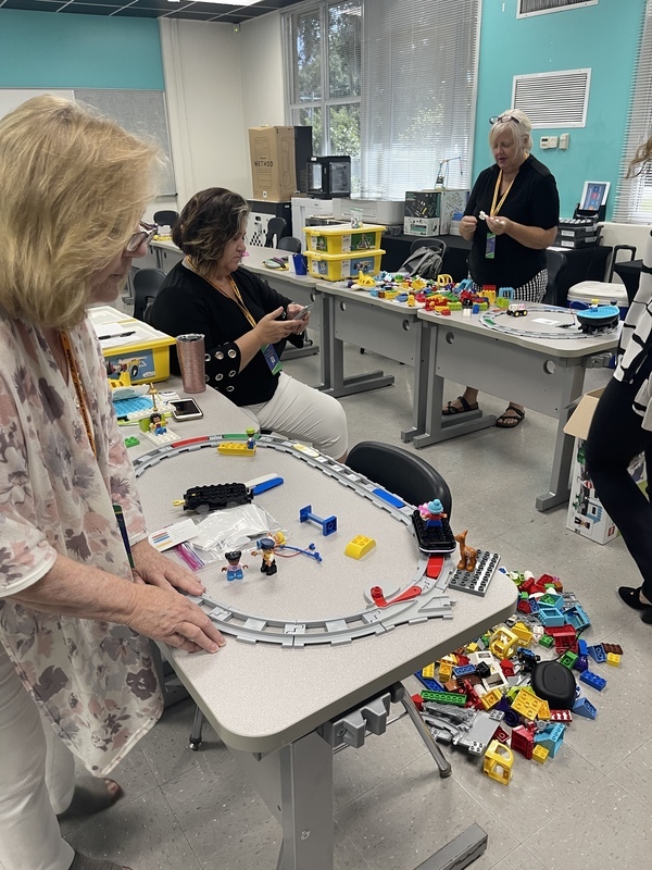 Teachers try out educational materials from Lego Education to see if they will meet their students' needs at the Florida Computer Science Festival in Palatka.