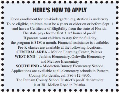 To qualify for pre-K, a child must be 4 years old on or before Sept. 1. Classes are offered at the following schools: Mellon Learning Center (Palatka), Ochwilla Elementary (Hawthorne), Melrose Elementary (Melrose), Jenkins Elementary (Interlachen) and Middleton-Burney Elementary (Crescent City).